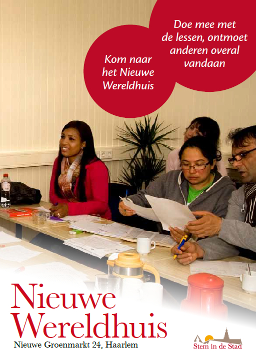 Het Nieuwe Wereldhuis op de Nieuwe Groenmarkt 24 maakt een integraal onderdeel uit van het programma Ontmoeten & aandacht van de oecumenische organisatie Stem in de Stad en is specifiek bedoeld om vluchtelingen, asielzoekers, ongedocumenteerde en arbeidsmigranten in Haarlem en omstreken een mogelijkheid te bieden een netwerk op te bouwen en aan hun toekomst te werken. Het Nieuwe Wereldhuis geeft naast een groot aanbod aan Nederlandse lessen, ook computerlessen, rekenlessen, de ondersteuning bij het vinden van vrijwilligerswerk- en werk en verscheidene excursies zoals Volkenkunde museum, stadswandeling of andere leuke activiteiten. Hier kunt u de flyer over het Nieuwe Wereldhuis lezen.