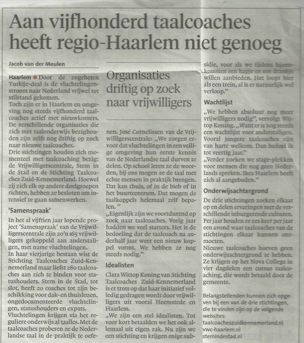 Taalcoaches gevraagd! 28/10/201728/10/2017 Lees hieronder het artikel uit het Haarlems Dagblad. Dit delen:Delen Klik om te delen op Facebook (Opent in een nieuw venster) Facebook Klik om te delen op X (Opent in een nieuw venster) X