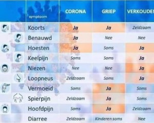 - Een handig overzicht van symptomen bij Corona, griep en verkoudheid: